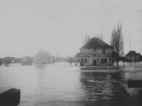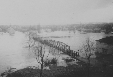 Im Jahre 1946 wurde der Holzteil der 5-Pfennigs-Brücke durch ein schweres Hochwasser der Werre fortgerissen. Auf den Bildern erkennt man die abgeknickte Holzkonstruktion.